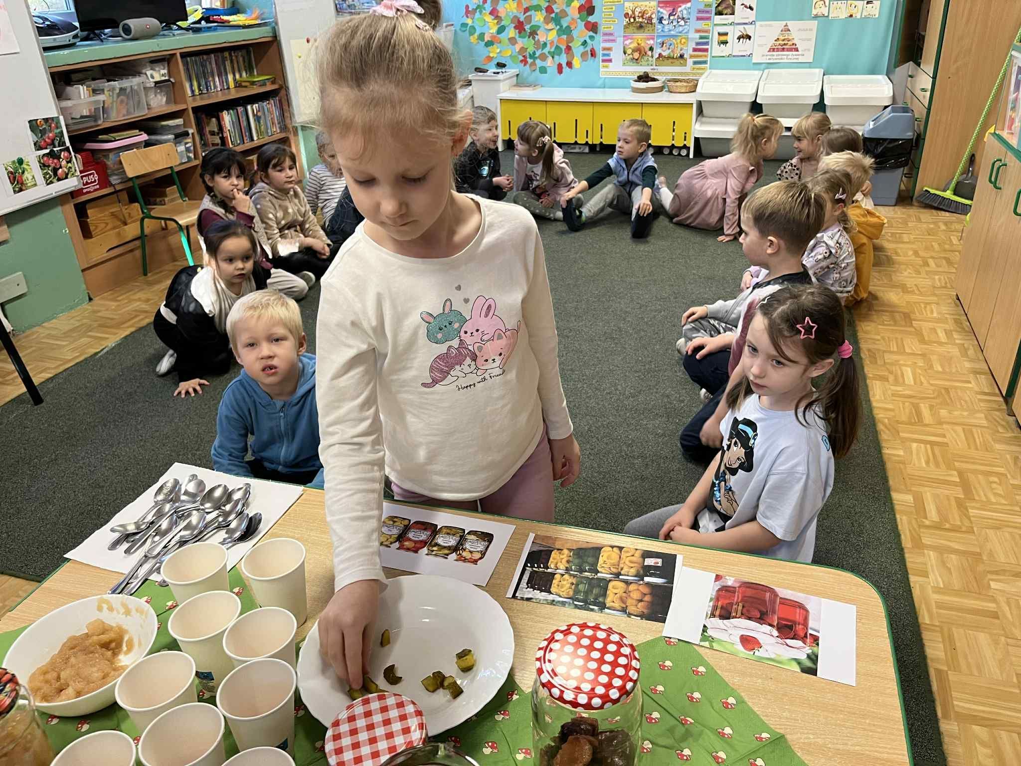 Starszaczki poznawały smaki przetworów. Podczas zajęć przedszkolaki dowiedziały się z jakich warzyw i owoców możemy wykonać domowe przetwory na zimę, oraz w jakim celu się je robi.