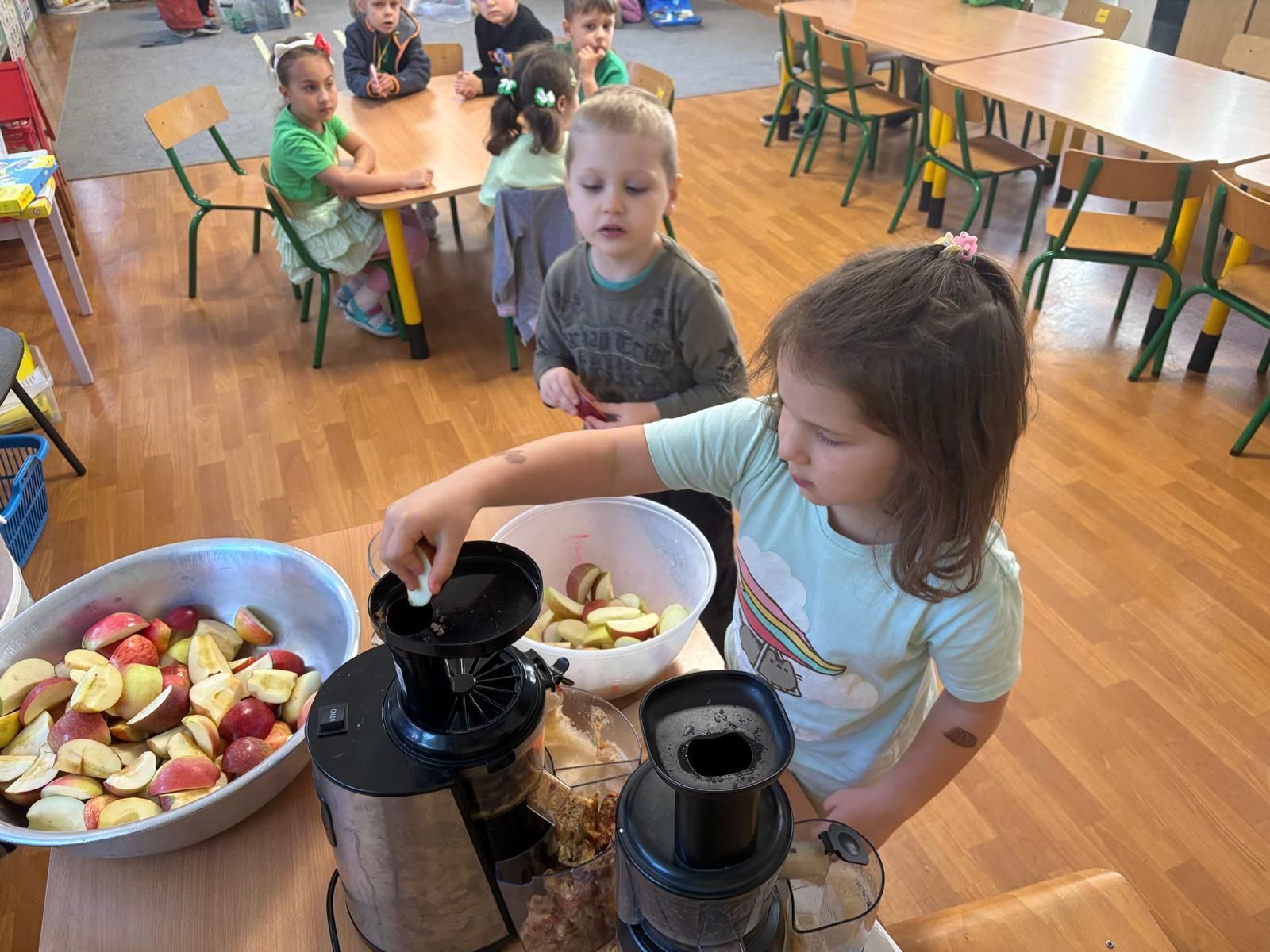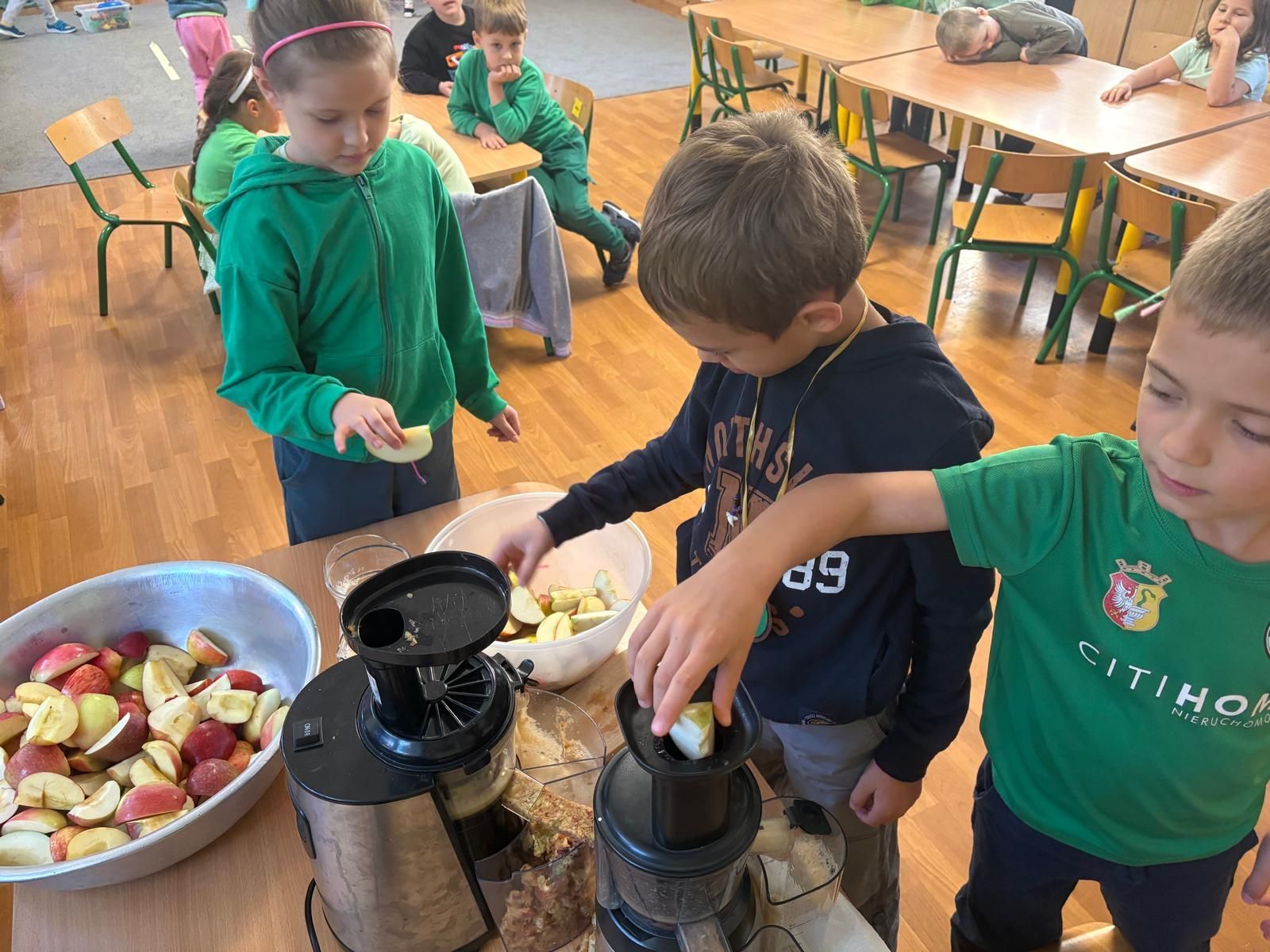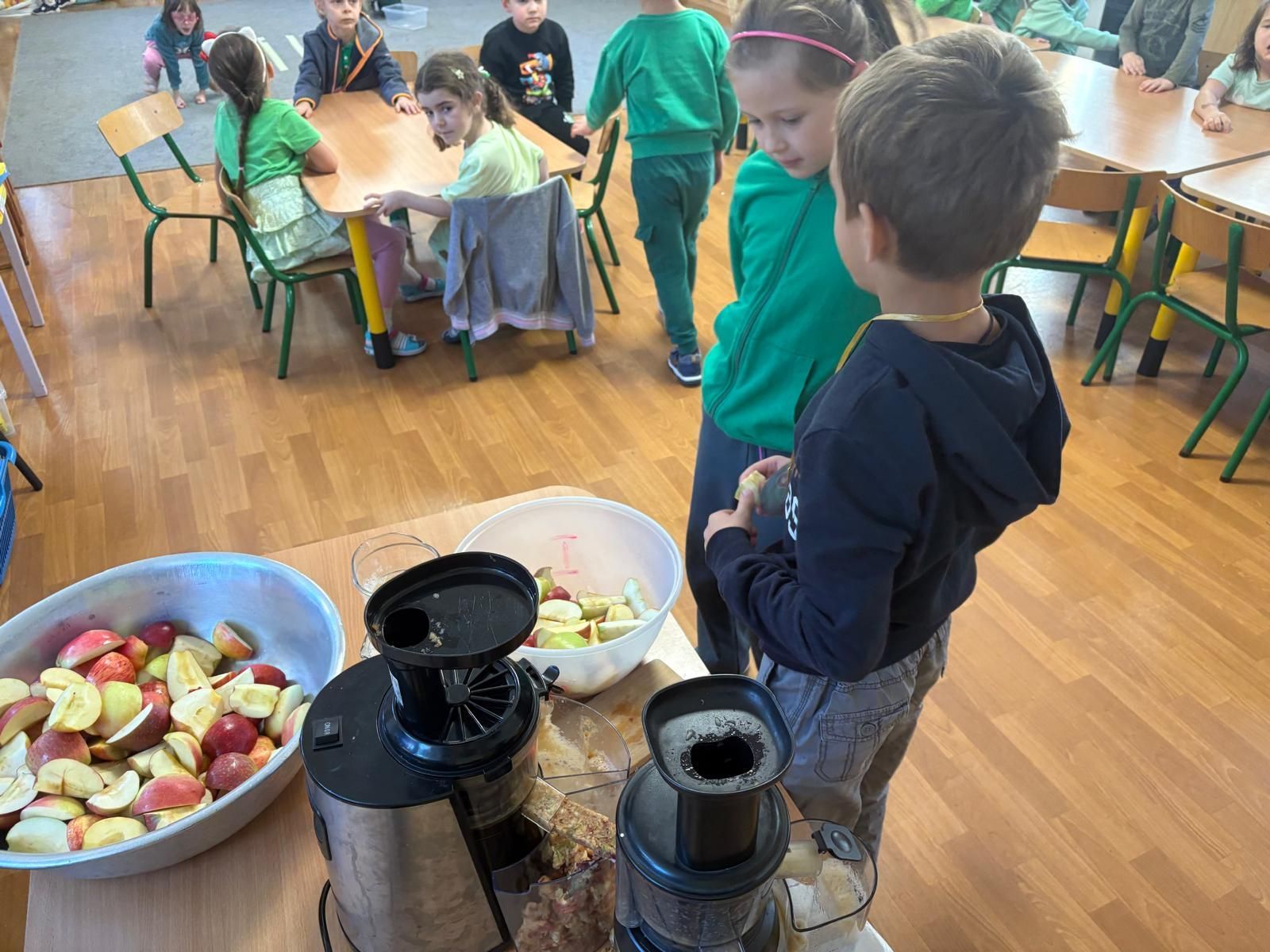 26 września obchodziliśmy w Przedszkolu Dzień Jabłka. Celem zajęć i wspólnej zabawy było zachęcanie Dzieci do spożywania owoców, a w szczególności jabłek i to pod różnymi postaciami z powodu walorów zdrowotnych i odżywczych. Już od samego rana można było przypuszczać, że to wyjątkowy dzień, ponieważ wszystkie Dzieci ubrane były na kolor zielono. To był bardzo ciekawy i intensywny dzień w Przedszkolu. Dzieci wszechstronnie poszerzały wiedzę o jabłku. Poznawały różne gatunki jabłek, rozpoznawały kształt, zapach, kolor, smak. Zdobywały wiadomości na temat potraw i przetworów z jabłek. Tego dnia dzieci również śpiewały wspólnie piosenki o jabłuszku, zatańczyły również „jabłkowy” taniec. Niesamowitą atrakcją było samodzielne wyciskanie przez dzieci jabłek i próbowanie świeżo zrobionego soku oraz próbowanie suszonych w suszarce jabłek. Dzieci rozwiązywały zagadki, uczestniczyły w konkursach grupowych, dowiedziały się również o tym jak rośnie jabłoń, zobaczyły na ilustracjach etapy rozwoju jabłka. Były również okazje do wykonania zadań matematycznych typu przeliczanie jabłek, porównywanie wielkości. Każda grupa wykonała pracę plastyczną przedstawiającą jabłko. Mamy nadzieję, że ten dzień zostanie w ich pamięci jako dzień zachęcania do jedzenia owoców i, że dzięki niemu dzieci będą chętniej sięgać po owoce i warzywa.