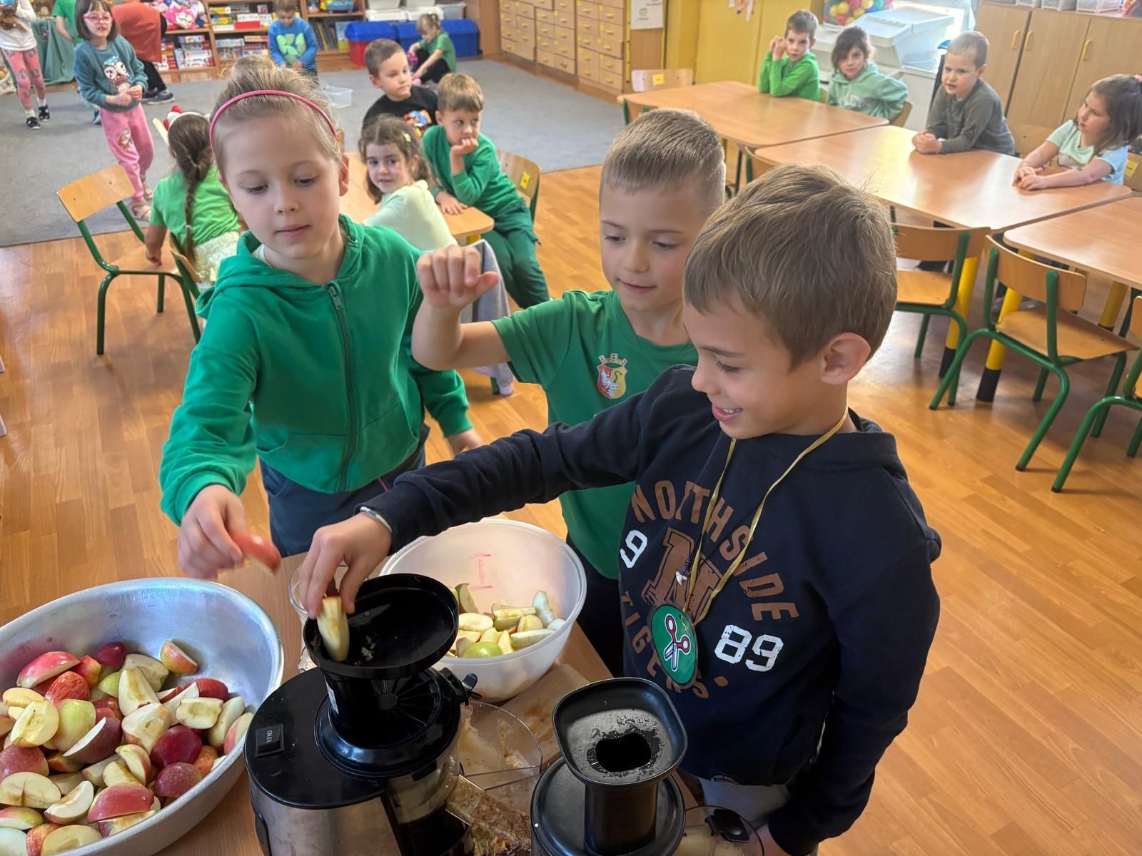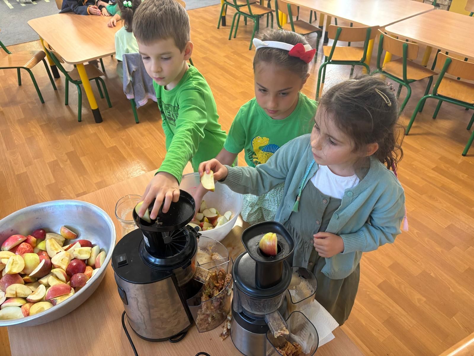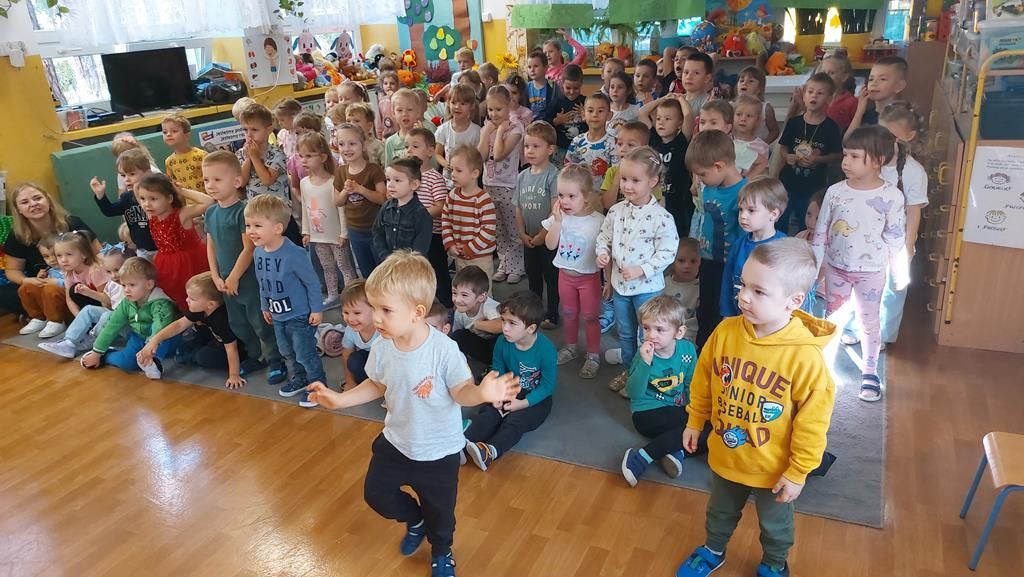 26 września obchodziliśmy w Przedszkolu Dzień Jabłka. Celem zajęć i wspólnej zabawy było zachęcanie Dzieci do spożywania owoców, a w szczególności jabłek i to pod różnymi postaciami z powodu walorów zdrowotnych i odżywczych. Już od samego rana można było przypuszczać, że to wyjątkowy dzień, ponieważ wszystkie Dzieci ubrane były na kolor zielono. To był bardzo ciekawy i intensywny dzień w Przedszkolu. Dzieci wszechstronnie poszerzały wiedzę o jabłku. Poznawały różne gatunki jabłek, rozpoznawały kształt, zapach, kolor, smak. Zdobywały wiadomości na temat potraw i przetworów z jabłek. Tego dnia dzieci również śpiewały wspólnie piosenki o jabłuszku, zatańczyły również „jabłkowy” taniec. Niesamowitą atrakcją było samodzielne wyciskanie przez dzieci jabłek i próbowanie świeżo zrobionego soku oraz próbowanie suszonych w suszarce jabłek. Dzieci rozwiązywały zagadki, uczestniczyły w konkursach grupowych, dowiedziały się również o tym jak rośnie jabłoń, zobaczyły na ilustracjach etapy rozwoju jabłka. Były również okazje do wykonania zadań matematycznych typu przeliczanie jabłek, porównywanie wielkości. Każda grupa wykonała pracę plastyczną przedstawiającą jabłko. Mamy nadzieję, że ten dzień zostanie w ich pamięci jako dzień zachęcania do jedzenia owoców i, że dzięki niemu dzieci będą chętniej sięgać po owoce i warzywa.